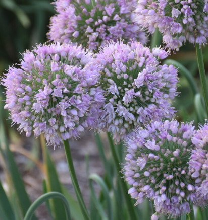 Kompakt termetű díszhagyma gömb alakú, halvány rózsaszín virággal.