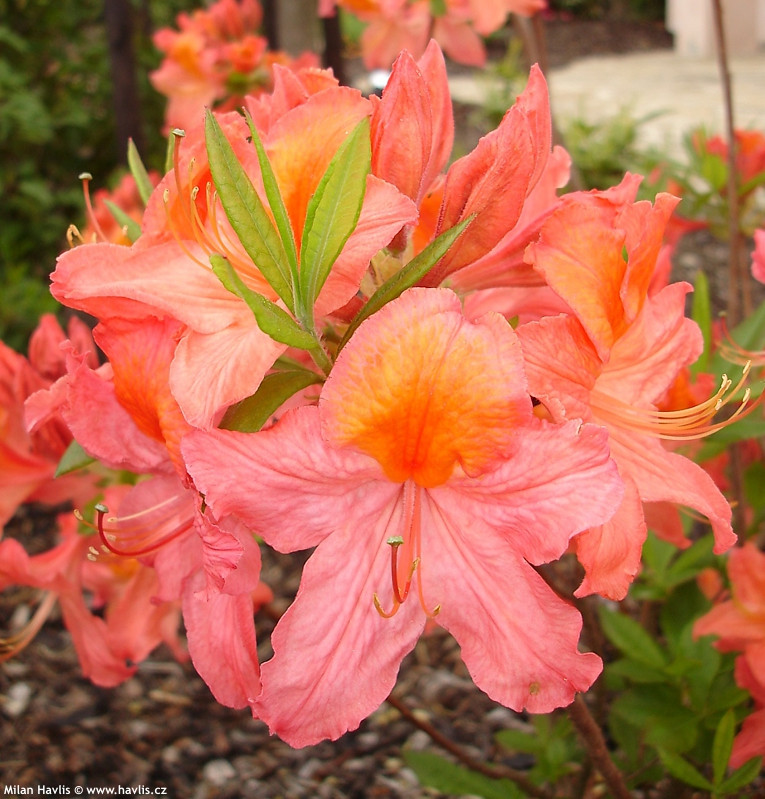Lombhullató azálea cserje sötétzöld levelekkel és nagy, gömb alakú, illatos, sötét lazacrózsaszín, narancssárga színű virágfürtökkel, amelyek májustól júniusig jelennek meg.